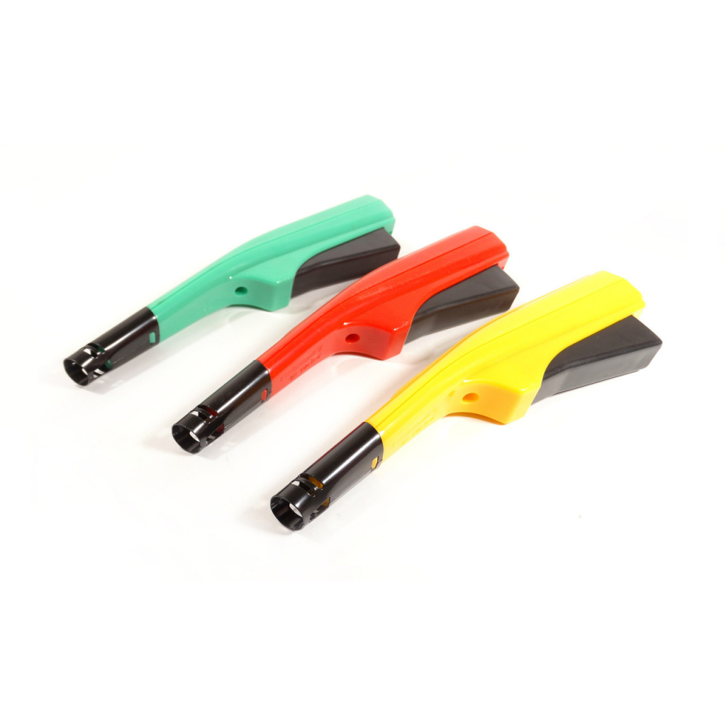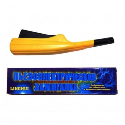 Зажигалка с пьезоэлементом механическая ( искра появляется при нажатии на кнопку, расположенную на рукоятки зажигалки) для газовых приборов  классическая и практичная.  Удобная  большая кнопка включения  находится на корпусе рукоятки. Отлично подходит для поджига газа в бытовых газовых приборах.