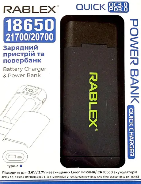 Портативний зарядний пристрій на 2А з функцією Power Bank Rablex RB410 для батареї 18650 - це багатофункціональний пристрій, який поєднує в собі зарядний пристрій для акумуляторів та портативний зарядний блок (Power Bank). Він розроблений для забезпечення зручності та мобільності, що робить його ідеальним вибором для активних користувачів.