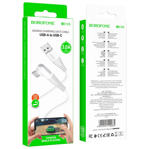 Завдяки нестандартній формі вихідного роз'єму, кабель Borofone BX105 розташовується паралельно грані смартфона з інтерфейсом, тому не заламується та не заважає під час ігор чи перегляду відео у горизонтальному положенні. Він стане чудовим вибором для тих, хто цінує якість, довговічність та зручність.