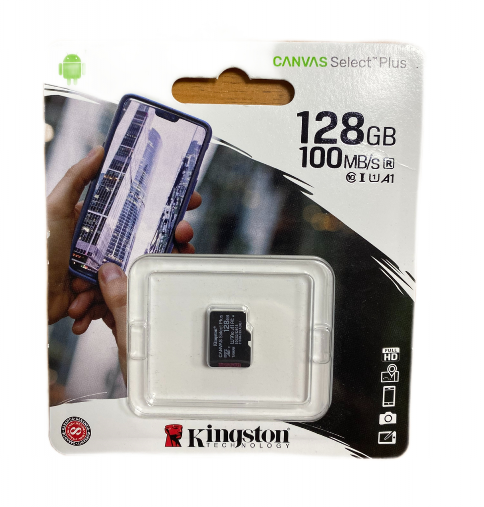 Картка пам'яті Kingston microSDHC 128 гігабайтів. Використовується для запису фото- або відеоматеріалів у відеокамерах або фотоапаратах, а також як накопичувач пам'яті в смартфонах, планшетах та інших мобільних пристроях.