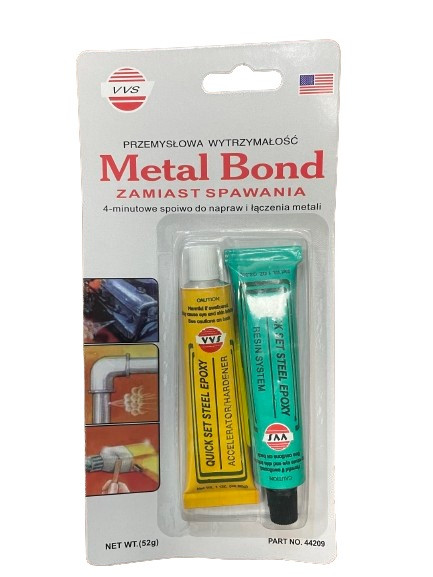 Двокомпонентний клей «Metal Bond» це швидкодіючий епоксидний клей для ремонту та скріплення металів з промислової витримкою. Ідеально підходить для скріплення металу з металом, для ремонту пошкоджень і заповнення втрат у металі, деревині і стінах, для усунення недоліків лиття. Metal Bond твердне в жорстку металеву масу (як сталь), яку можна свердлити, шліфувати, нарізати і обробляти. Твердне і скріплює в результаті хімічної реакції. Застосовується при найбільш відповідальних роботах будинку, в цеху, під час ремонту човнів, автомобілів, приладів, двигунів. Відмінна хімічна стійкість.