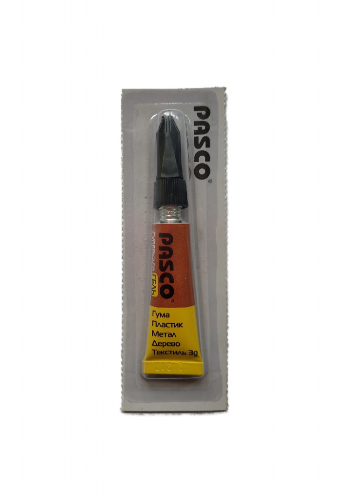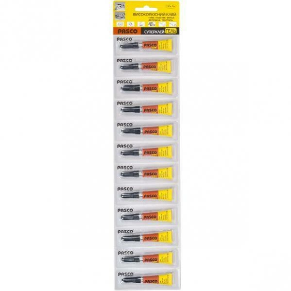 Гелевий прозорий клей "PASCO" 3 г у металевому тюбику з носиком-дозатором. 12 шт. на планшеті. Призначений для склеювання різних матеріалів — паперу та картону, гуми, металу, пластику, дерева, текстилю та шкіри. Для повного висихання клею потрібно кілька годин.