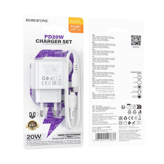 Комплект швидкого зарядного пристрою BOROFONE BAS43A PD 20W — це універсальне та компактне рішення для максимально швидкого й ефективного заряджання твоїх сучасних гаджетів. До набору входить мережевий адаптер (МПЗ) з одним портом USB-C та кабель Type-C на Type-C довжиною 1 метр (3.2 фути). Адаптер підтримує високу вихідну потужність 20W та протоколи швидкої зарядки Power Delivery (PD) і Quick Charge (QC), що дозволяє миттєво заряджати смартфони, планшети та інші пристрої (включно з iPhone, Samsung, Xiaomi та ін., що потребують Type-C). Пристрій має компактний дизайн, корпус із вогнетривкого матеріалу та багаторівневий захист для безпечного використання.