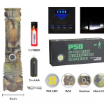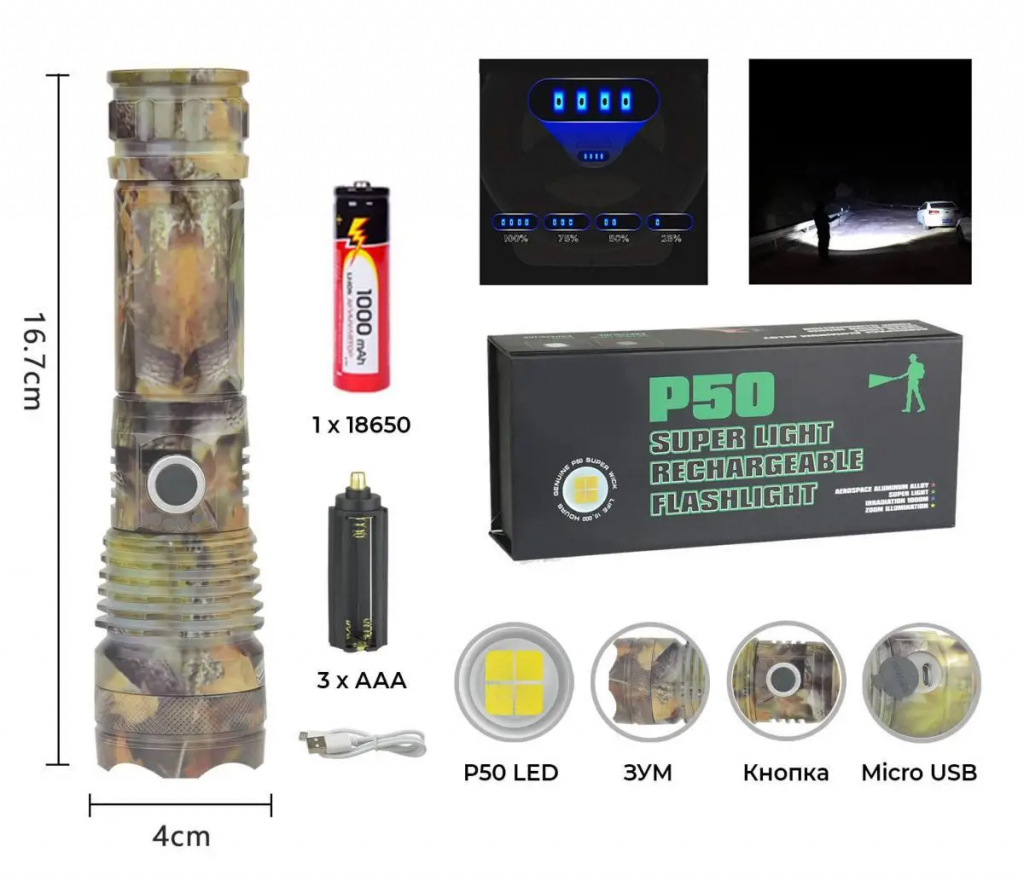 Ліхтар оснащений сучасним світлодіодом P50 та має функцію ZOOM (фокусування променя), що дозволяє легко перемикатися між широким розсіяним світлом і вузьким далекобійним променем. Живиться від потужного акумулятора типу 18650, який витримує 800-1000 циклів заряду. Зарядка здійснюється через USB-кабель. Камуфляжне забарвлення робить його ідеальним для маскування.