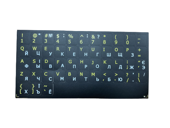 Наклейки з російською та англійською розкладками. Наклейки йдуть окремо на кожну клавішу. Усі літери та символи білого кольору на чорному тлі. Поверхня наклейок глянсова. На клавішах "А" і "Про" (рос.) є спеціальні прорізи в нижній частині (для засічок, які є на всіх клавіатурах).