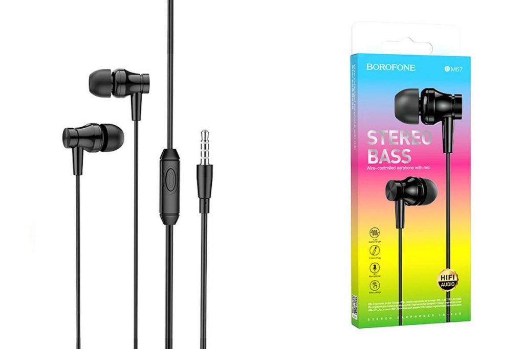 Вакуумні навушники Borofone BM67 — чудовий вибір моделі у своїй ціновій категорії, якнайкраще підходять для щоденного використання. Модель виділяється стильним дизайном, представленим двома забарвленнями, ергономічністю і приголомшливою якістю відтворення з потужними басами, ідеальним балансом високих і середніх частот. Вушні елементи реалізовані в оригінальній формі, виготовлені з ABS пластику та мають глянсову поверхню, яка підкреслює їхній привабливий зовнішній вигляд. Кабель завдовжки 1.2 м зроблений у міцному обплетенні з термопластичного каучуку, що робить його стійким до сплутування, розтягнення і зламів. Модель обладнана чудовим мікрофоном, який реалістично передає мовлення, і функціональною кнопкою, призначеною для керування відтворенням, приймання та завершення дзвінків. Завдяки роз'єму mini-Jack 3.5 mm ця гарнітура може під'єднуватися до більшості моделей сучасних смартфонів і величезної кількості різних аудіопристроїв.