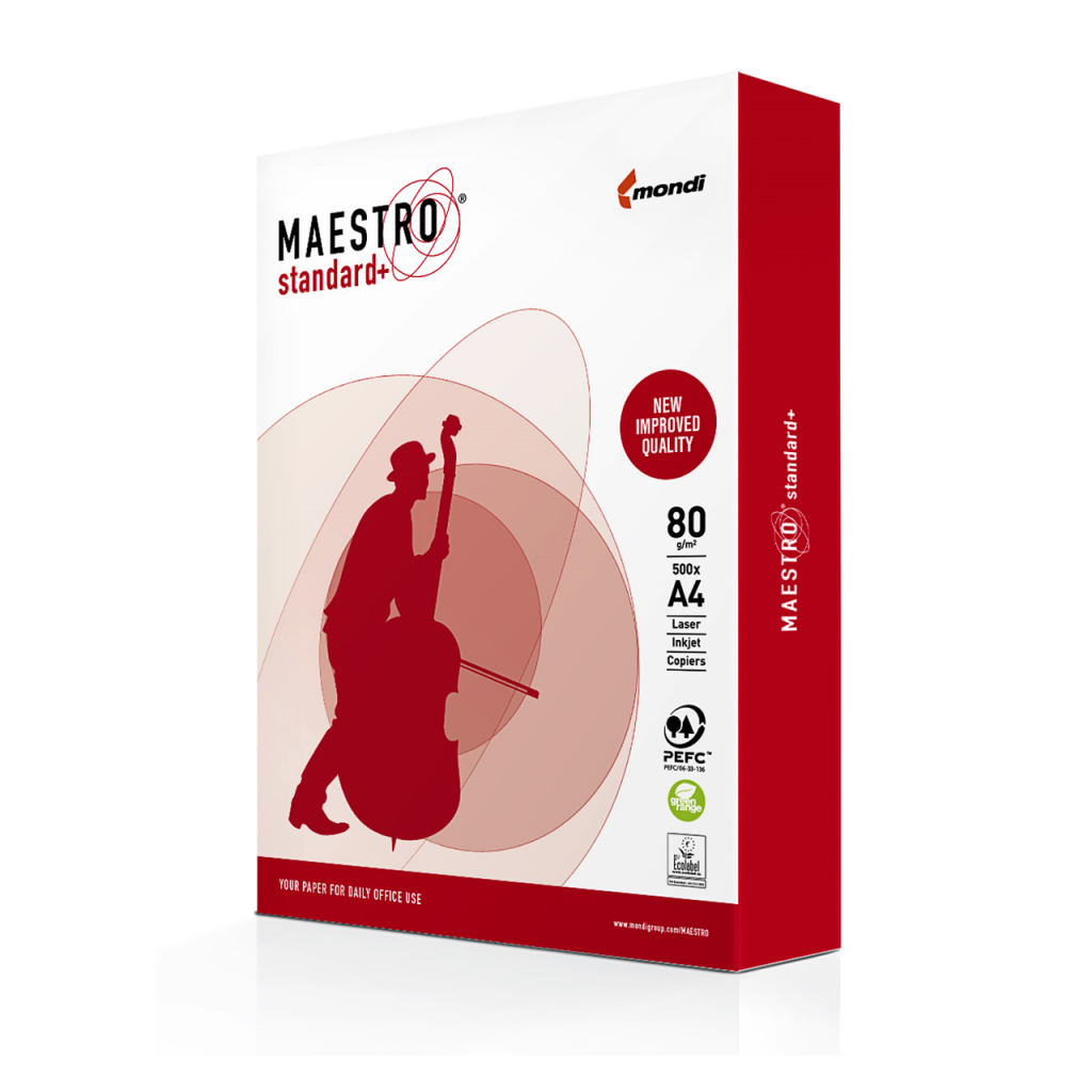 Матовий білий папір Maestro Standart А4 з шорсткою поверхнею створений для забезпечення поточних потреб офісу. А4 – найпопулярніший в офісі формат аркуша, який підходить для щоденного роздрукування потокових документів – рахунків фактури, накладних, бухгалтерських та фінансових звітів, комерційних пропозицій, ділових листів та договорів. Пачка складається із 500 листів щільністю 80 г/м2. Ступінь білизни за стандартом CIE – 161% (клас B+). Результат використання паперу Маестро Стандарт Плюс для принтера – виразні, виразні відбитки, глибокий чорний відтінок при роздруковуванні чорно-білих текстових документів та зображень, яскраві кольори під час багатобарвного друку.