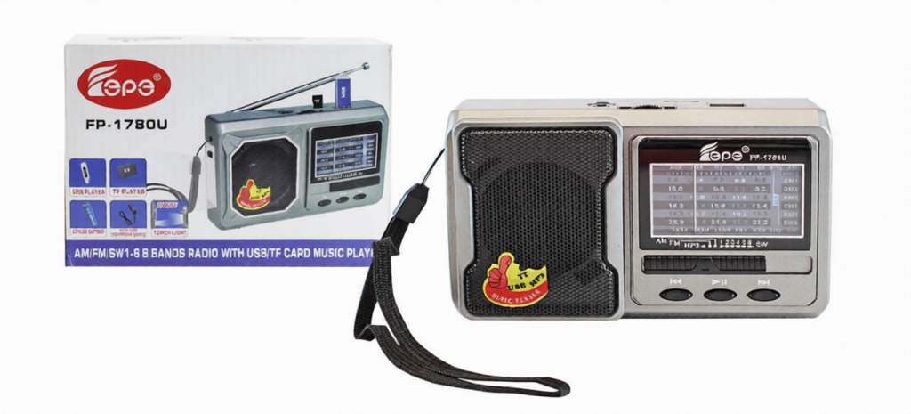 Радіоприймач FEPE FP-1780U — це компактний та багатофункціональний пристрій, який стане незамінним супутником вдома, на дачі або в поїздці. Модель підтримує 8 діапазонів мовлення (AM, FM та 6 каналів SW), забезпечуючи впевнений прийом сигналу навіть у віддалених місцях. Крім радіо, пристрій працює як повноцінний музичний програвач: ви можете відтворювати улюблені треки з USB-флешки або карти пам'яті TF. Приймач оснащений вбудованим яскравим ліхтариком (Torch Light), що особливо зручно у темний час доби. Живлення здійснюється від літієвого акумулятора, який можна зарядити через USB-кабель, що йде у комплекті. Сучасний дизайн, телескопічна антена та зручний ремінець роблять використання приймача максимально комфортним.