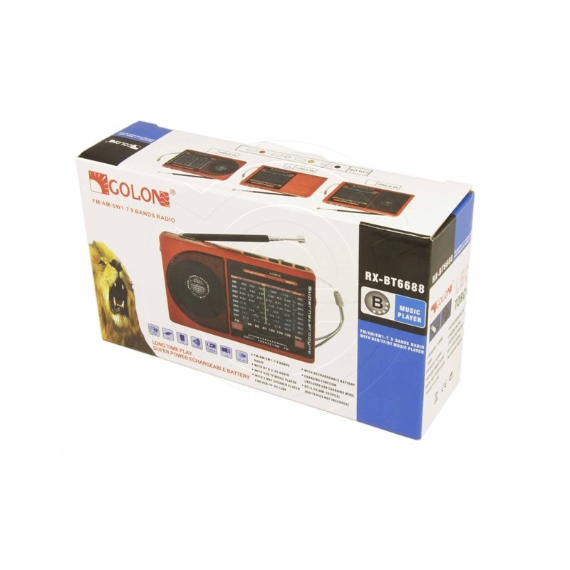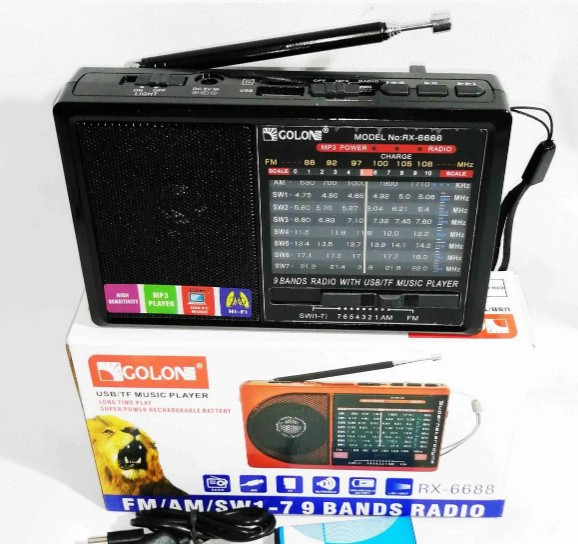 Приймає трансляції радіостанцій в FM діапазоні, а також відтворює аудіофайли у форматі MP3/WMA (музика і аудіокниги). Радіоприймач "GOLON" RX-6688 має вбудований ліхтарик. Відмінний вибір для дачі або будинку!