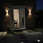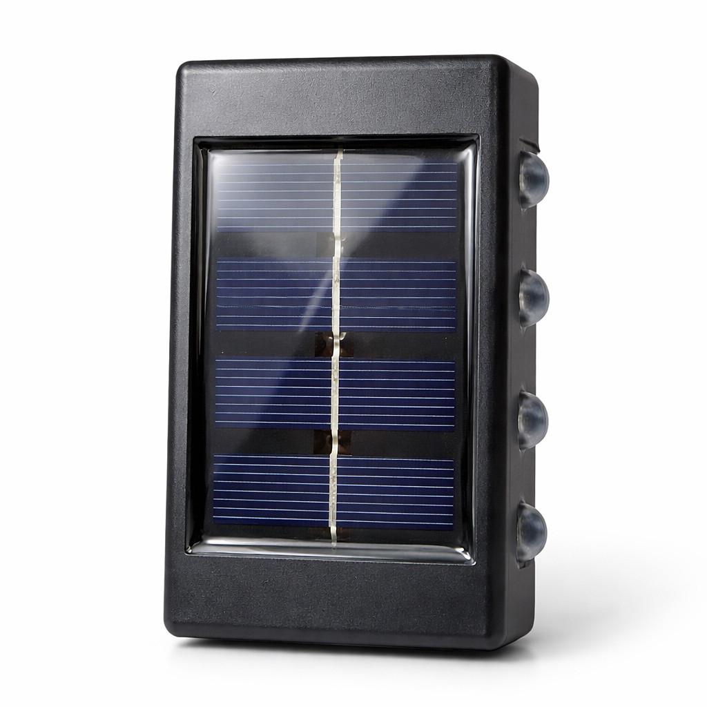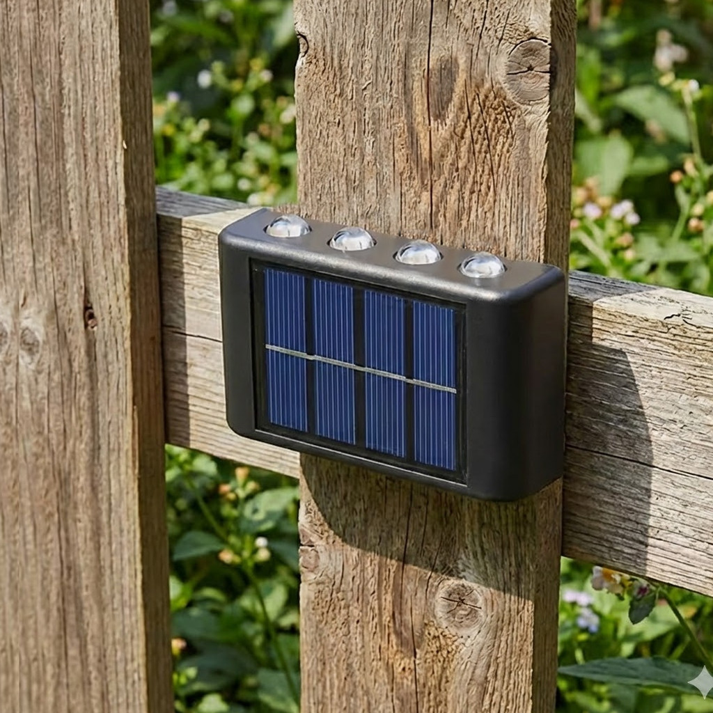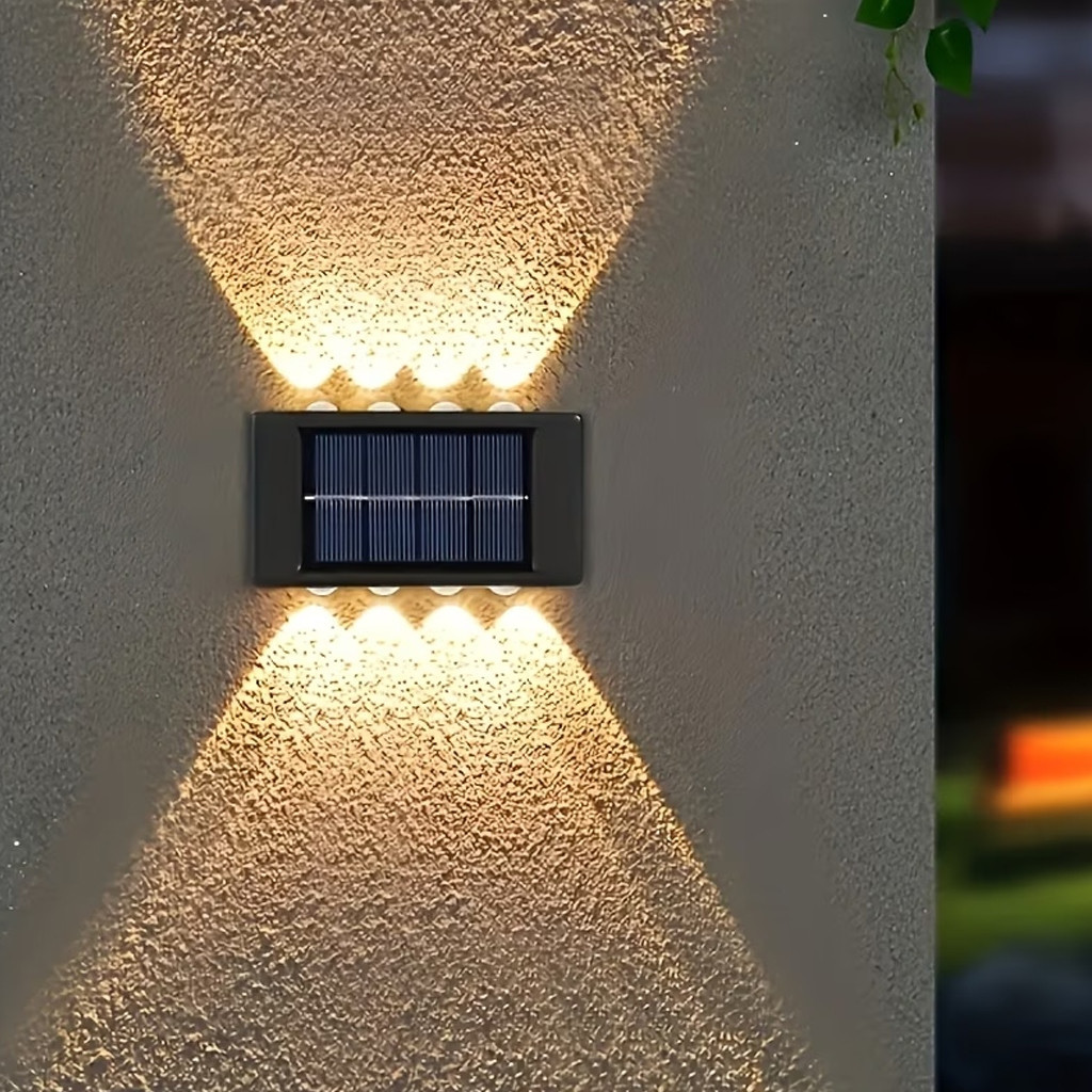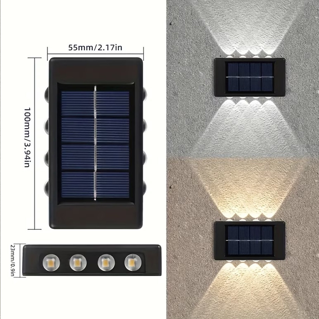 Вуличний фасадний світильник BK-8 — це сучасне та екологічне рішення для декоративного освітлення вашого будинку, саду або тераси. Завдяки вбудованій сонячній панелі, світильник повністю автономний: він заряджається протягом дня від сонячного світла та автоматично вмикається з настанням сутінків. Дизайн пристрою передбачає двостороннє світіння — по 4 яскраві світлодіоди зверху та знизу, що створює ефектні світлові промені на стіні, підкреслюючи архітектуру будівлі або фактуру паркану. Світильник виконаний у міцному пластиковому корпусі із захистом від вологи, що дозволяє використовувати його на відкритому повітрі за будь-якої погоди. Легко монтується на будь-яку вертикальну поверхню без необхідності прокладати дроти.